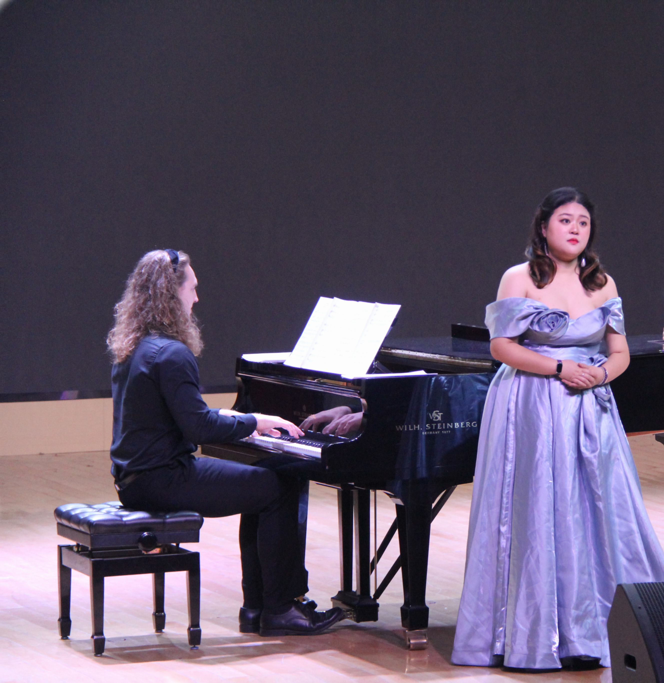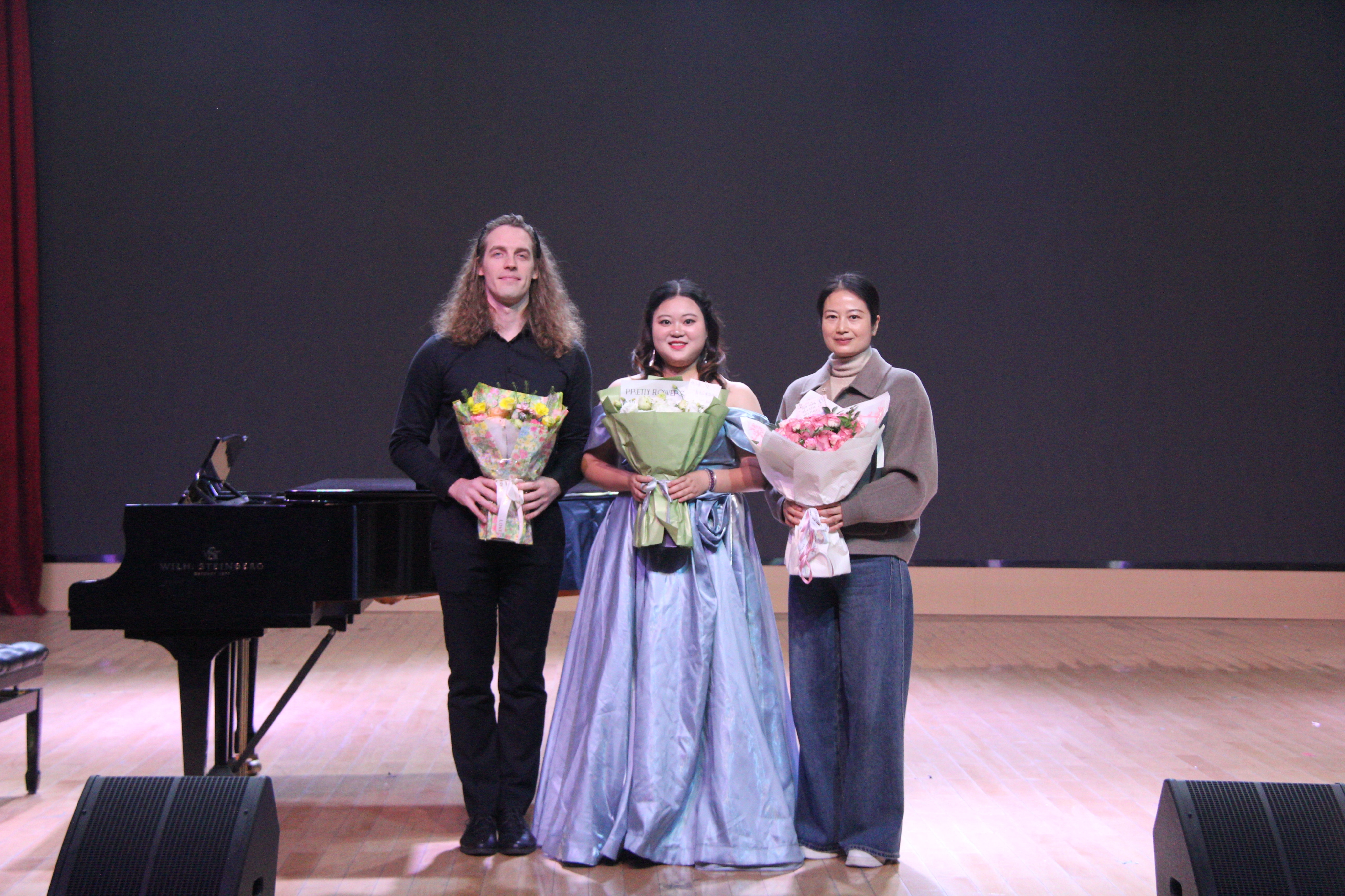下半场从黄自的另一代表作《玫瑰三愿》开始,旷奕在简洁的旋律中传递出丰富的情感内涵。贝里尼《温雅女神》与舒伯特《你是安宁》的演绎,呈现出对意大利美声与德奥艺术歌曲不同美学取向的初步探索。莫扎特《费加罗的婚礼》两首选段《美妙时刻即将来临》与《待到微风轻轻吹过》的演唱,展现出轻快灵动的旋律与精准的角色表达。赵季平作曲的《幽兰操》以现代声乐语言诠释古典诗文,旷奕较好地把握了作品中的文人气息与音乐张力。音乐会在《我爱你中国》的激昂深情中推向高潮。最后,音乐会在莫扎特歌剧重唱选段《待到微风轻轻吹过》的和谐共鸣中圆满结束,象征着合作精神与共同成长。