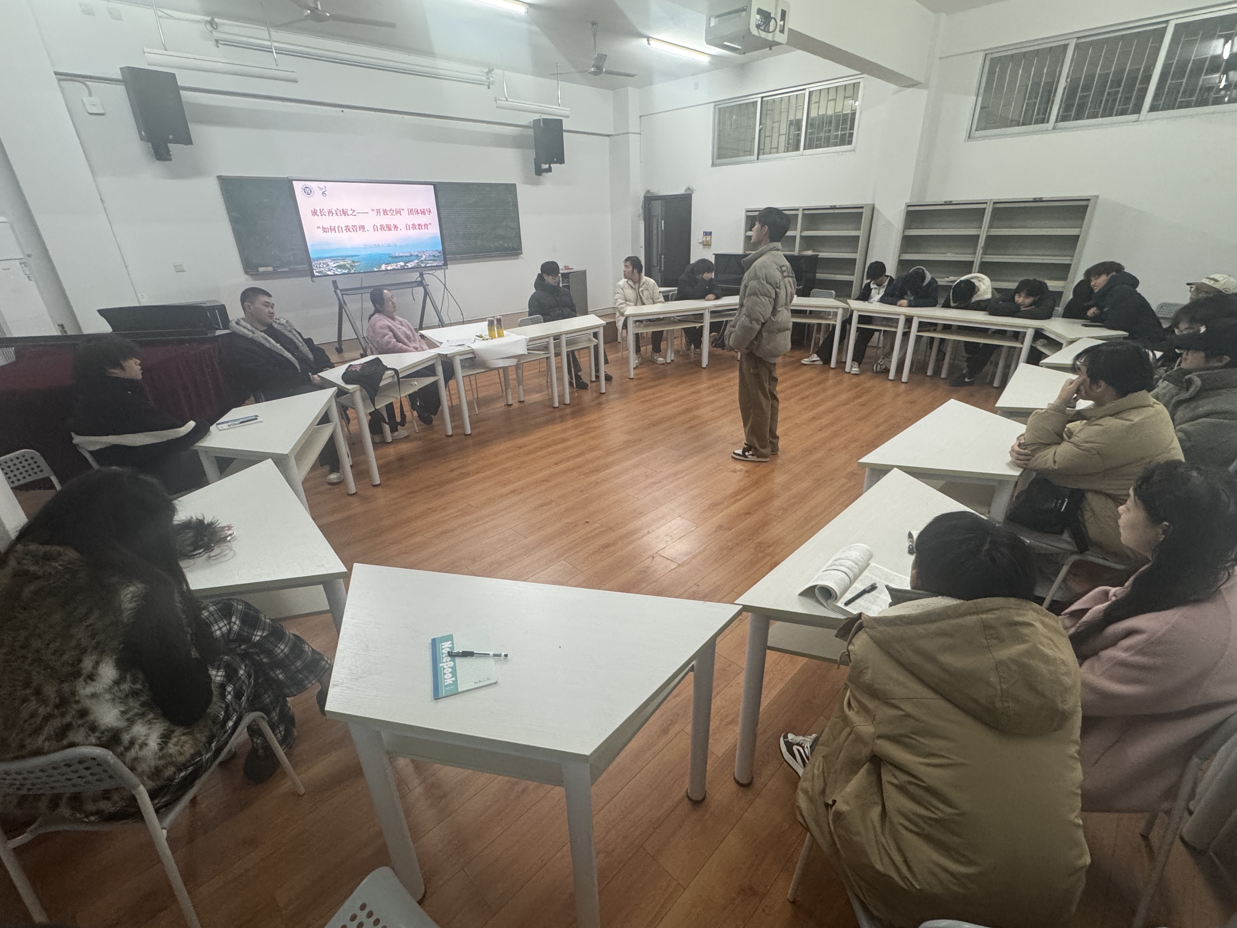 2025年12月8日晚,sunbet申搏“成长再启航”学生教育专题培训第六讲在学院4202教室举行。本次培训创新形式,由学院党委副书记蔡奕主讲,以“开放空间”团体辅导形式呈现,围绕“如何自我管理、自我服务、自我教育”展开议题讨论深入互动。2025级辅导员孙征、2024级辅导员李亮菁、2023级辅导员胡程锦到场参与。