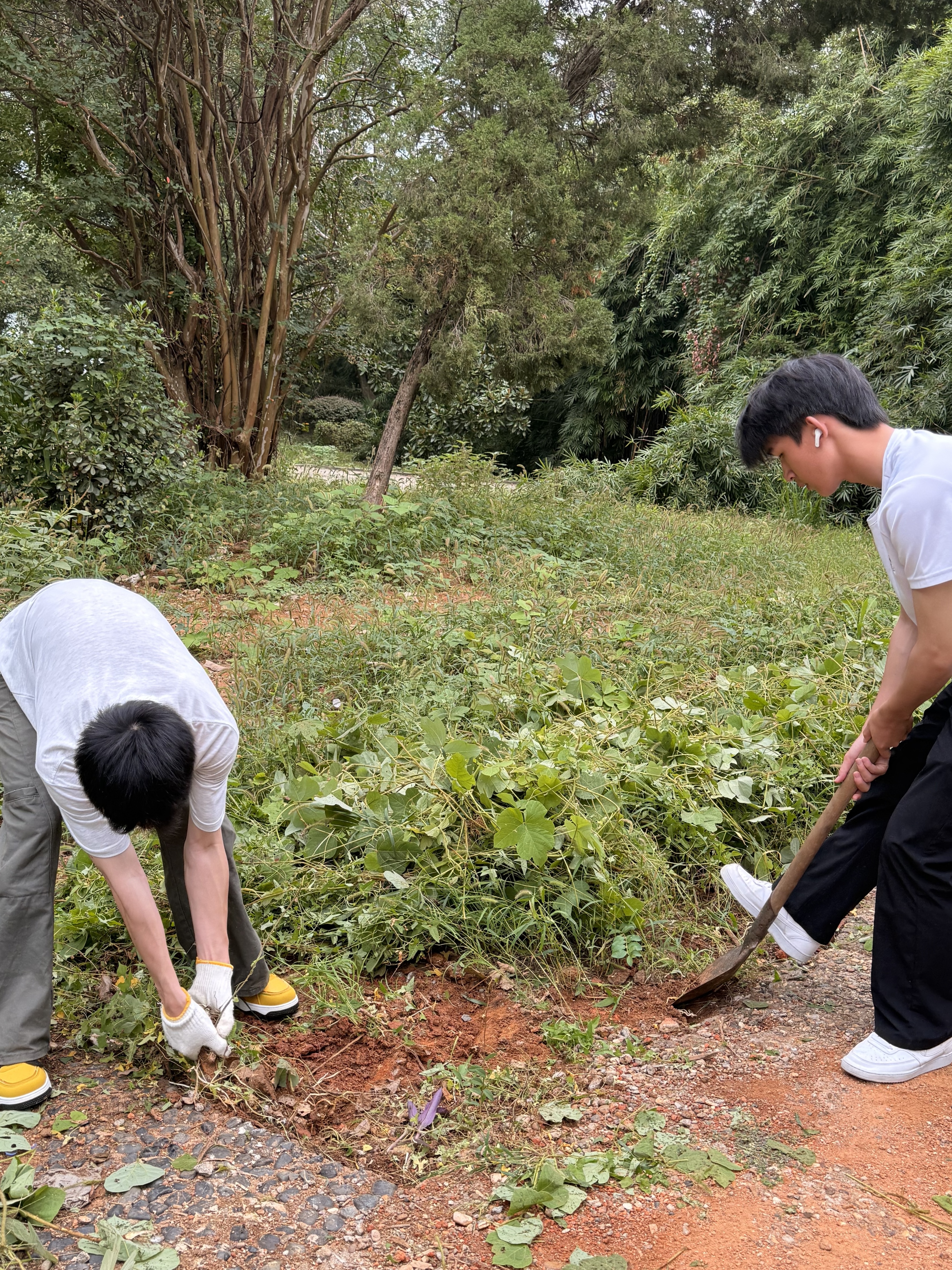 活动中,新生以小组为单位分工协作、高效行动。室外小组手持小铲与镰刀聚焦草地清理,不仅重点拔除恶性杂草,还细致清理了石缝中残留的草根。室内小组则携带工具开展清扫工作,部分同学负责擦拭琴房琴凳下方的积尘与钢琴表面浮灰,另一部分同学拖净舞蹈教室地面污渍,并同步收纳墙角散落的杂物。孙征老师全程在现场指导清洁与除草技巧,师生携手投入劳动,现场氛围热烈而有序。
