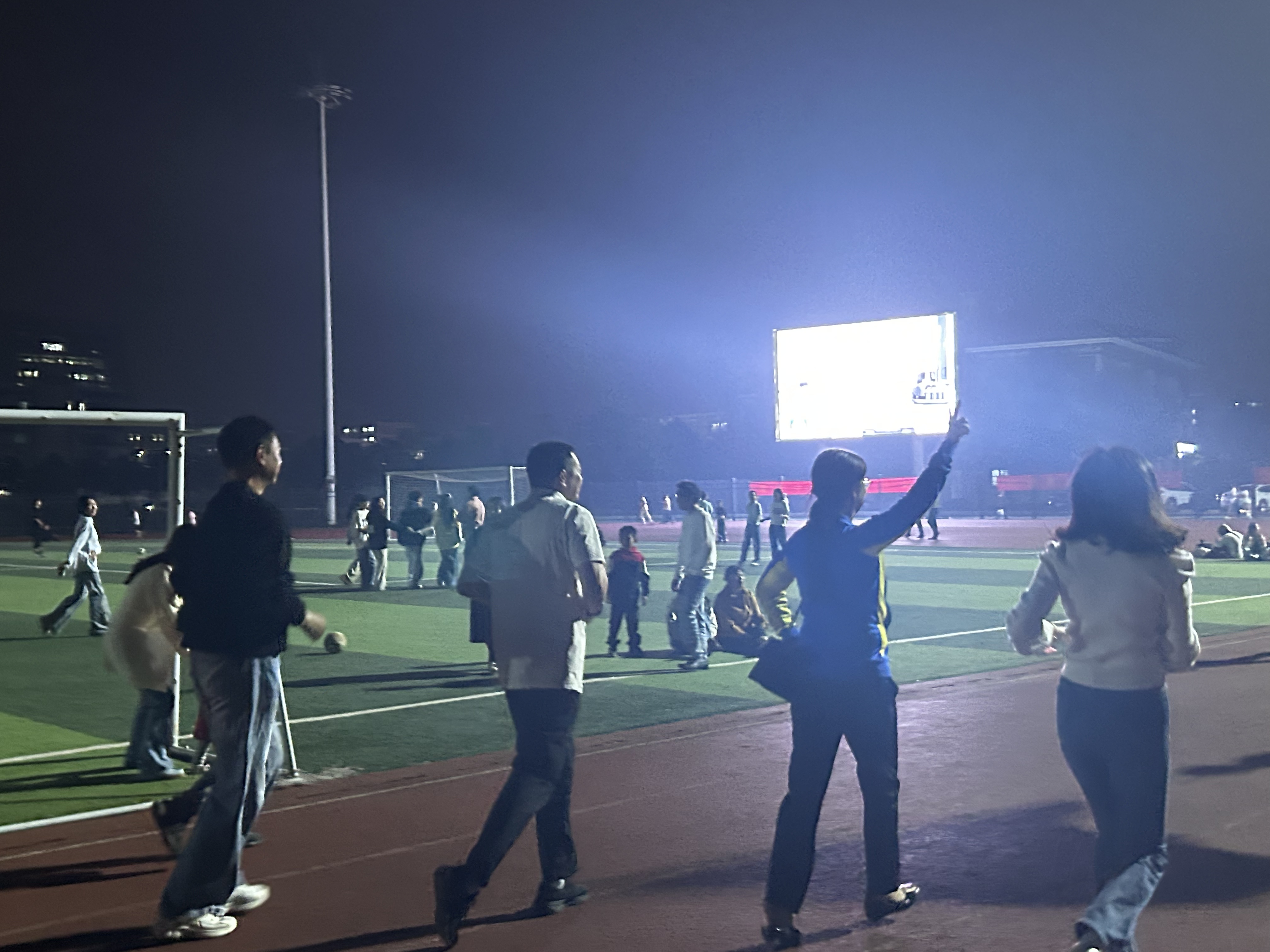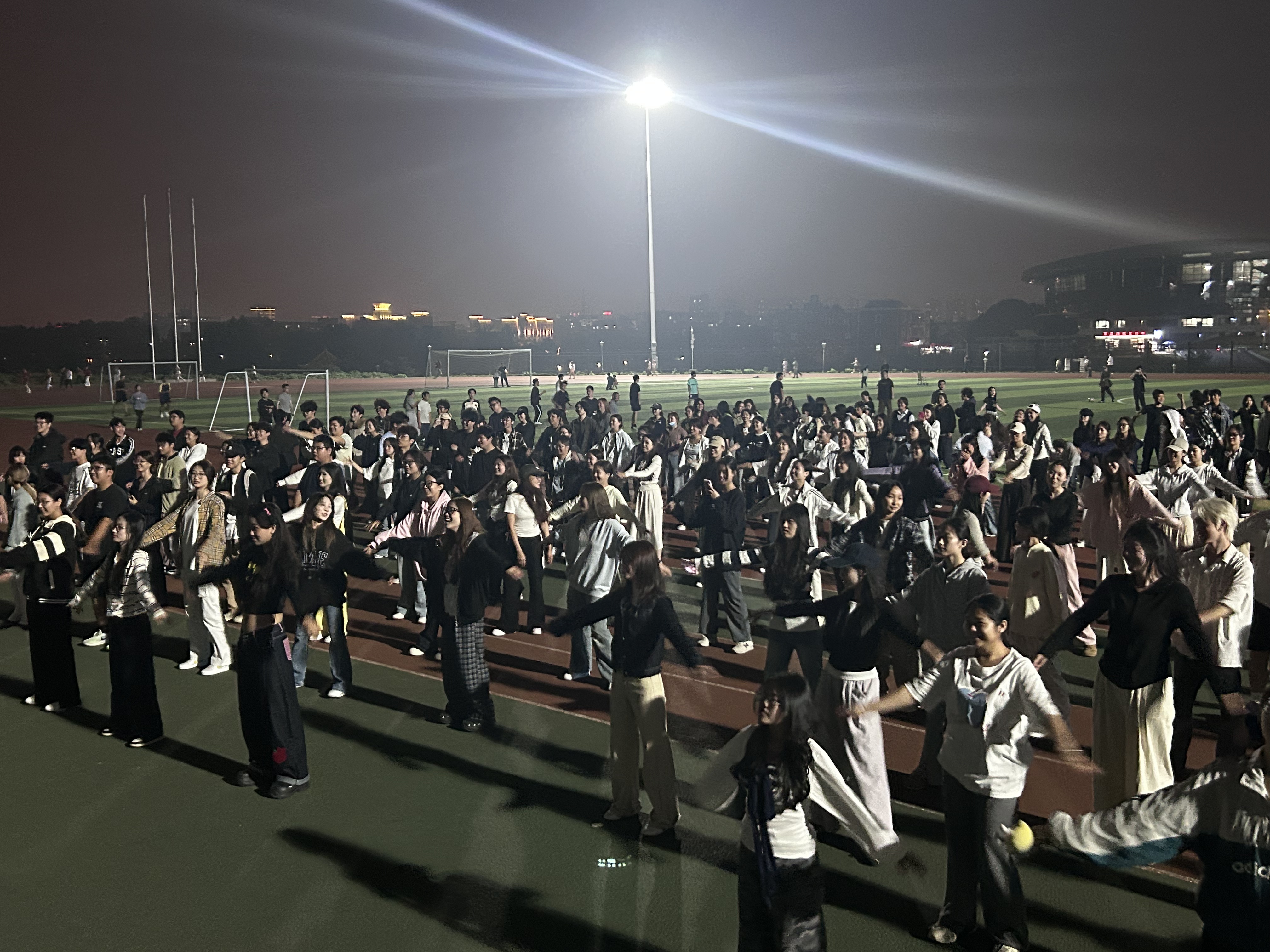 活动伊始,院党委副书记蔡奕作动员讲话。她既鼓励同学们积极参与夜跑,明确活动“增强体质、助力学习”的核心目的,也着重叮嘱“安全第一”,提醒大家活动前务必做好热身准备。随后,领操员带领全体参与者完成专业热身动作,为夜跑安全保驾护航。随着夜跑环节正式启动,动感音乐响起,老师们率先领跑,步伐稳健有力。同学们紧随其后、互相鼓劲,伴着节奏调整呼吸。田径场上,脚步声、笑声与音乐声交织,构成傍晚校园里最鲜活动人的画面。