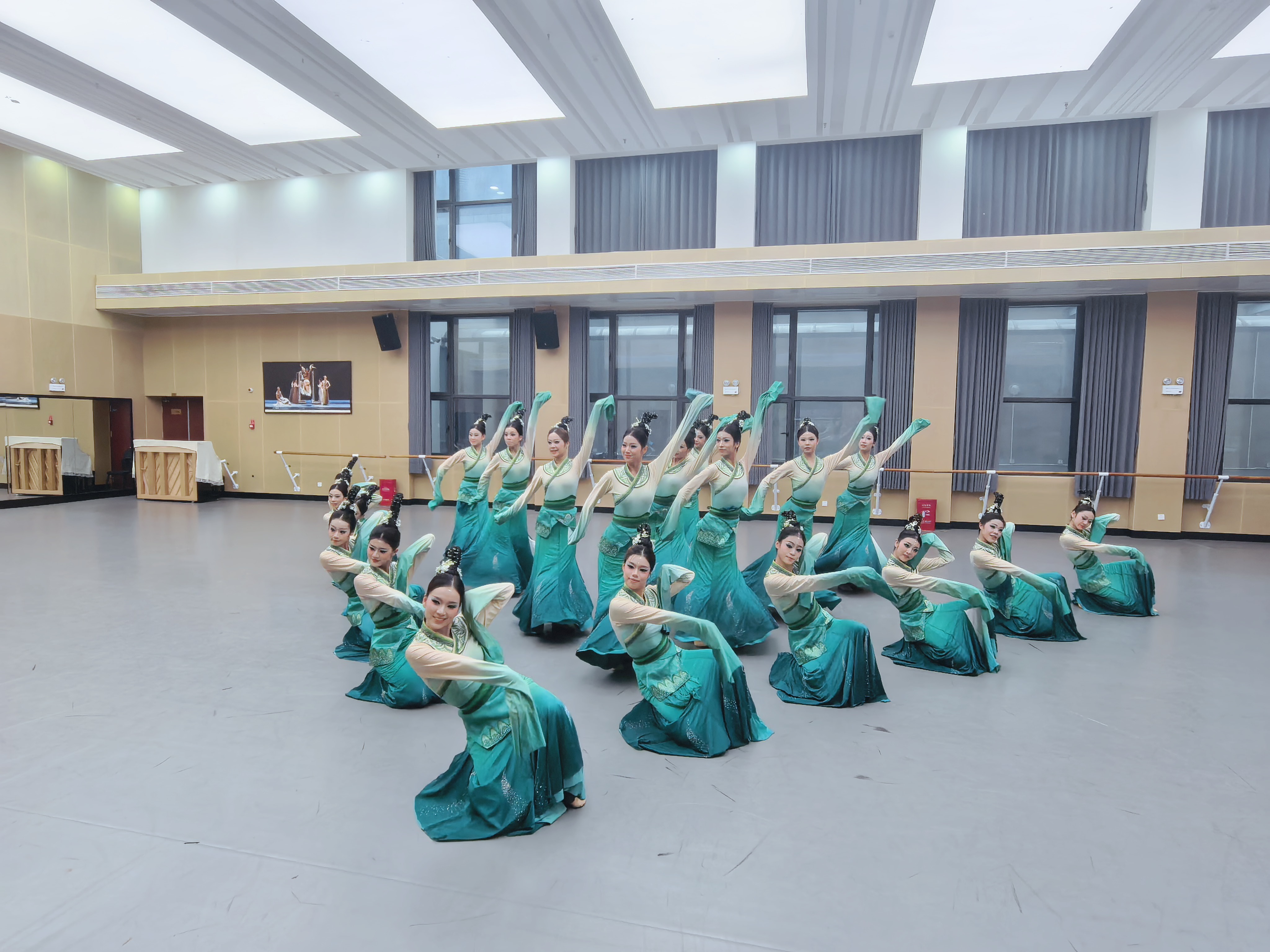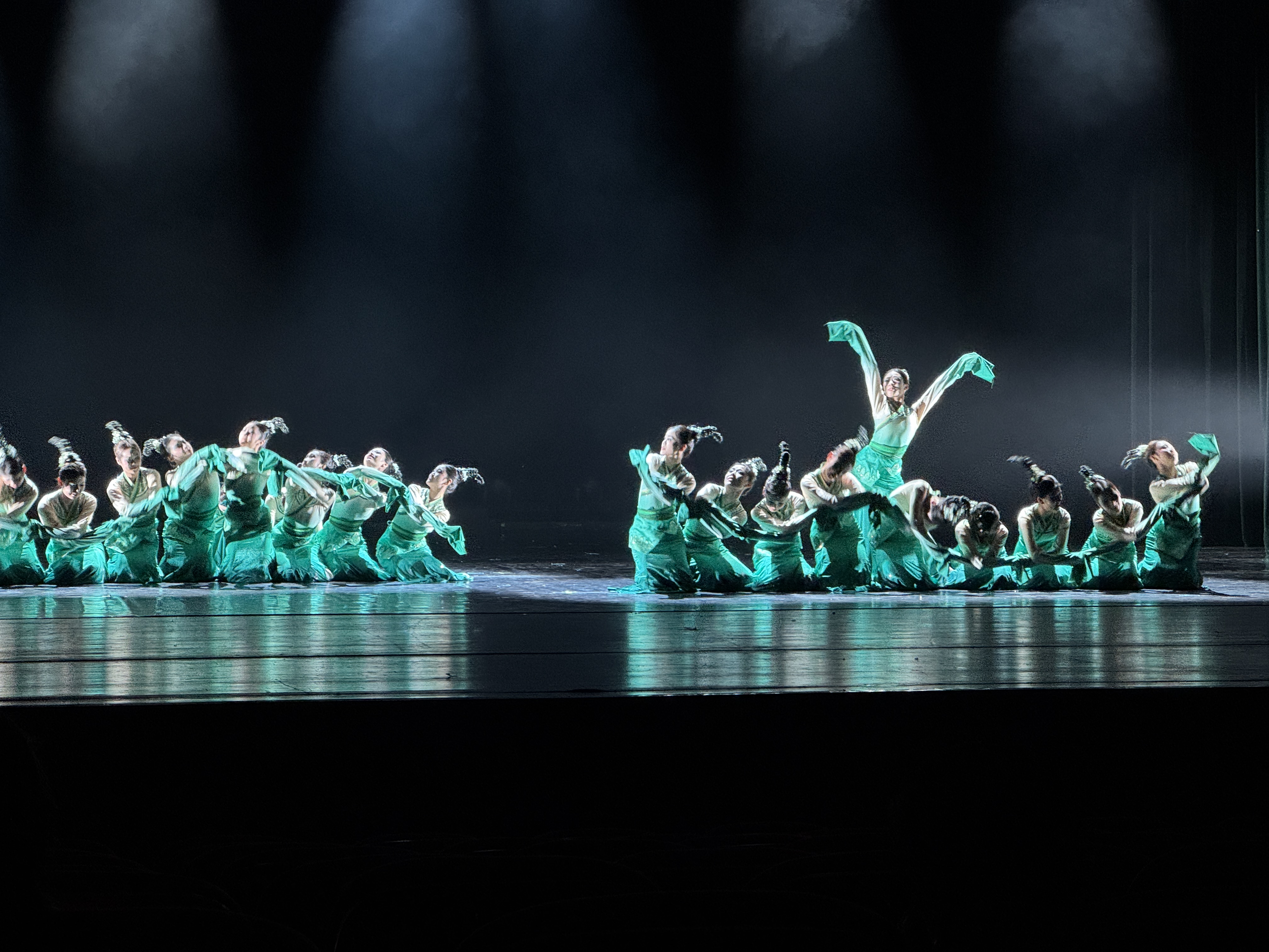 在视觉呈现上,舞者手持青绿渐变的飘逸短纱,随着身体的旋转与舞动,薄纱轻扬,时而如茶烟袅袅升腾,时而似洞庭湖上晨雾弥漫,营造出“杯中叶影舞,空中翠烟生”的诗意画卷。这一设计不仅强化了作品的视觉效果,更精准传递出君山银针“形如群笋出土,状似银刀林立”的形神之美,实现了自然意象与身体表达的完美交融。