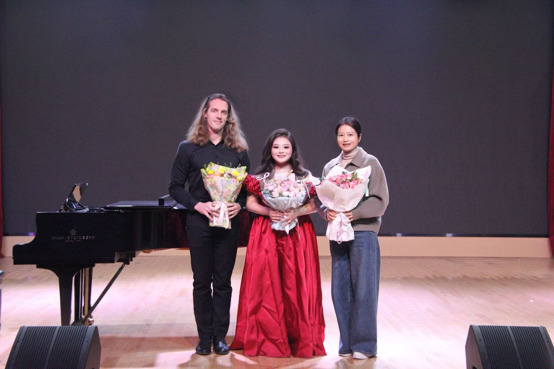 音乐会上半场曲目融合西洋经典与中国艺术歌曲,风格多元且韵味十足。亨德尔的《绿树成荫》、格鲁克的《我怀着满腔热情》尽显西洋古典声乐的典雅,圣·托马斯·阿奎纳作词、弗兰克作曲的《天神赐粮》与舒曼的《献词》,让观众领略到不同时期西洋声乐作品的艺术特色;而黄自的《玫瑰三愿》、贺绿汀作词、陆在易改编的《清流》,则以婉转的旋律勾勒出中国艺术歌曲的诗意之美,中西作品的交织演绎,为上半场演出奠定了雅致的艺术基调。