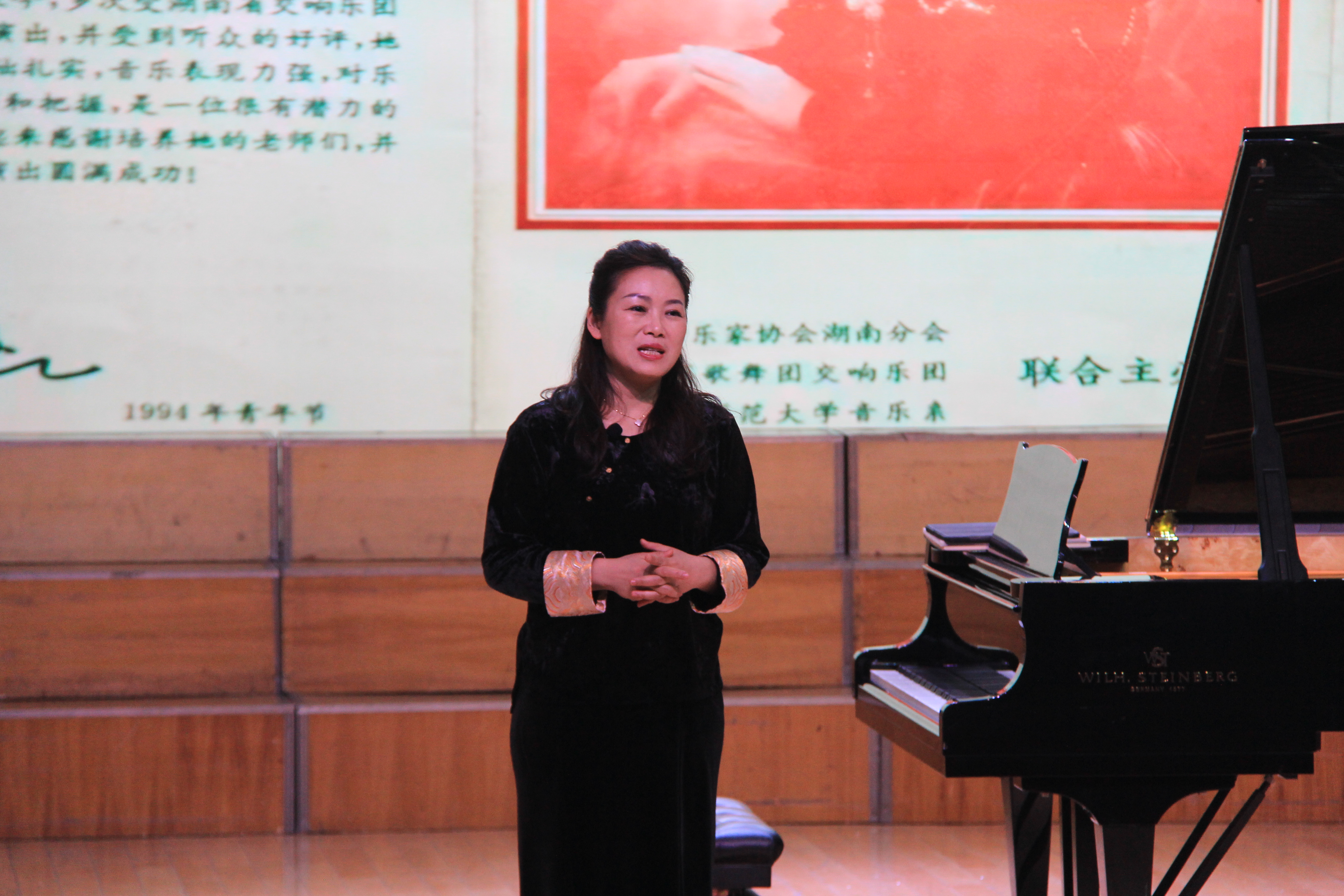 讲座尾声,水冰教授倡导师生在研习西方钢琴技法的同时,积极演奏和推广中国钢琴作品,传承中华优秀传统文化,并推荐了《中国钢琴曲集》《钢琴百年经典》等优质教材。作为岳阳籍音乐人,她表达了在家乡高校分享艺术心得的荣幸与欣慰,希望能激发青年学子对中国钢琴音乐的热爱与传承责任感。