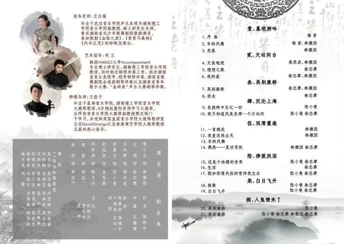 歌剧《再别康桥》创作于2001年,由中国著名歌剧导演陈蔚编剧,首都师范大学教授周雪石作曲,是国内第一部小剧场歌剧。它取材于在20世纪二三十年代的名人故事——才女林徽因与诗人徐志摩、建筑学家梁思成、名媛陆小曼之间的情感纠葛。此次演出有墓地游吟、天坛同台、再别康桥、沉沦上海、双清重逢、挣脱泥沼、白日飞升、人鬼情未了8个章节。