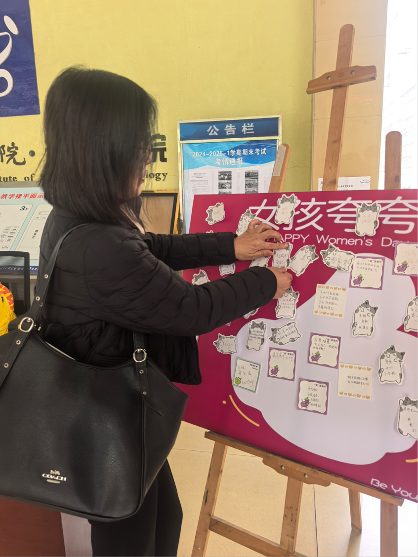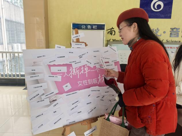 活动以“撕掉标签,拥抱自我”环节开场。学院大厅,一块醒目的公告栏上贴满了写有各类刻板印象的贴纸,“恋爱脑”、“健身是为了男人”、“赚那么多钱有什么用”等等话语格外刺眼。这些标签长期以来成为束缚女性的无形枷锁。众多女老师和女同学积极参与,纷纷走上前,亲手撕掉这些标签,以实际行动表达打破传统偏见的决心。