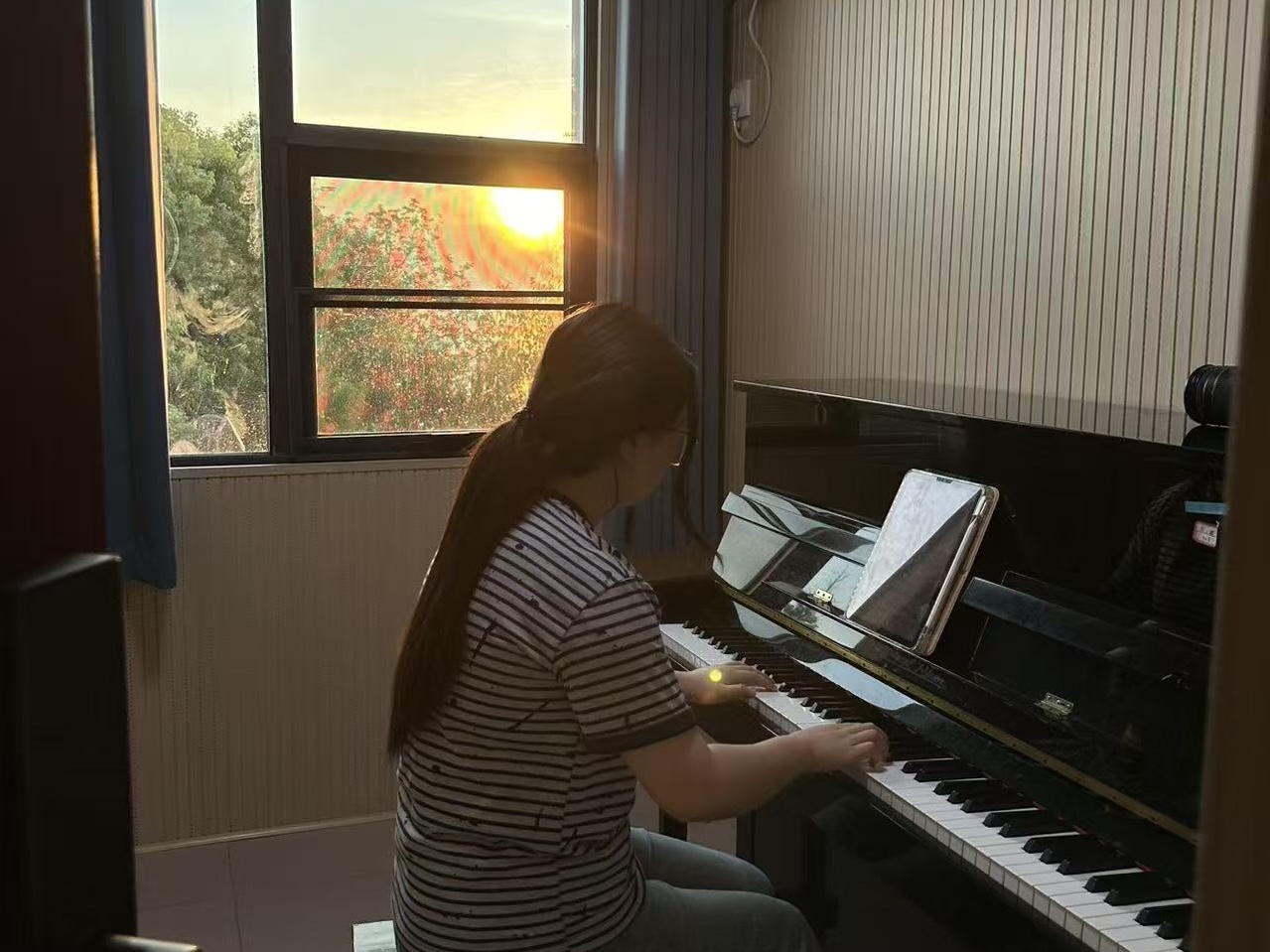 “夕阳下的校园,是梦想加速的时刻。”庞毅副教授感慨道,“学生们这个时间段的专注力往往更好,也更珍惜安静的练习环境。看到他们为了心中的旋律如此努力,作为老师,陪伴和指导他们,无论多晚都值得。这份坚持,是音乐道路上最宝贵的品质。”