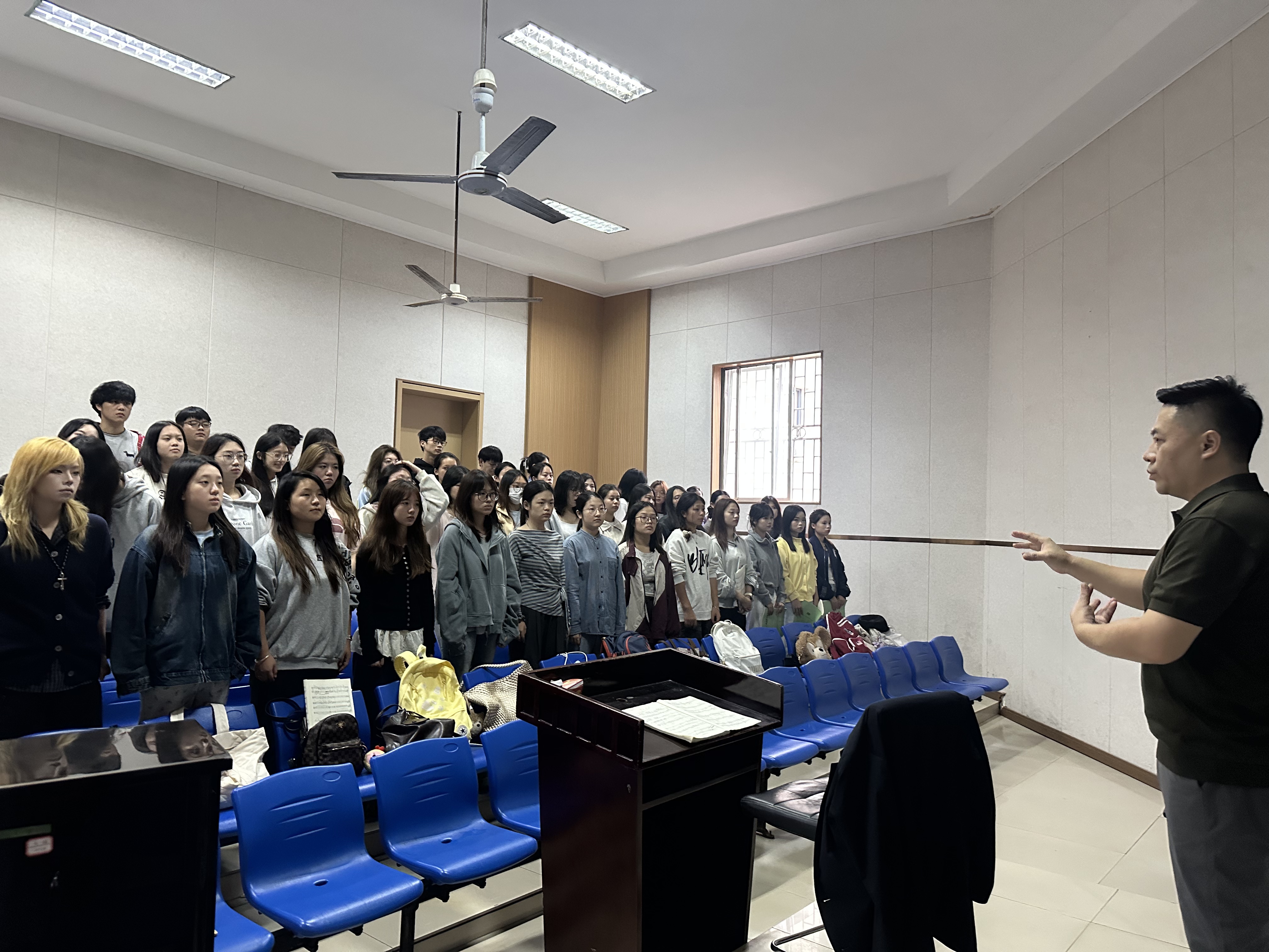 排练厅里灯火通明,管弦乐团、民乐团、合唱团的排练正如火如荼进行。指挥老师目光如炬,精准地捕捉着每一个细微的不和谐,耐心地讲解、示范,引导着年轻的乐手们理解和声的精妙与协作的力量。“再来一次!注意情绪,这里要更加流动!” 宋杨老师的声音在偌大的空间里回响。学生们全神贯注,或紧盯着指挥棒,或检视着自己的乐器,一遍遍合奏、分练,将课堂知识转化为舞台上的默契与震撼。深夜的排练,既是技艺的提升,更是意志的磨练,只为追求那更加完美的艺术呈现。