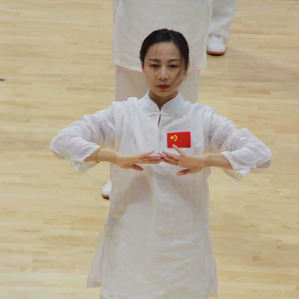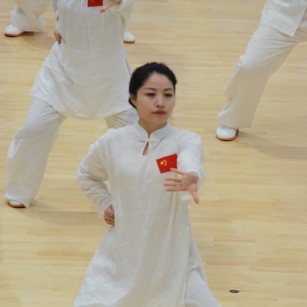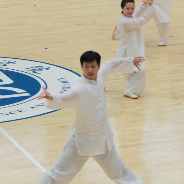 决赛场上,我院教师队伍先以一段简短而又精彩的戏曲台步舞开场,将音乐、舞蹈与中华传统文化相结合,展现了我院特有的魅力。随后,伴着八段锦舒缓的音乐,老师们着装整齐,精神饱满,气定神闲,自然地做出双手托天、左右开弓等标准动作。一招一式,动作到位,张弛有度,寓刚于柔。整齐划一的队列,标准舒展的动作,充分将八段锦的健身精神融入到每个细节之中。
