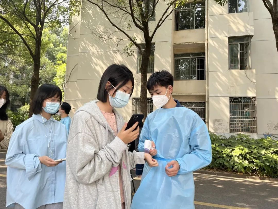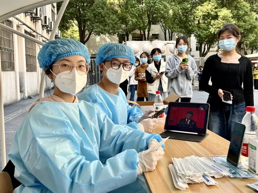 二号园区核酸检测点,他们用心留意每一个来做核酸的人,叮嘱戴好口罩,保持1米安全距离。