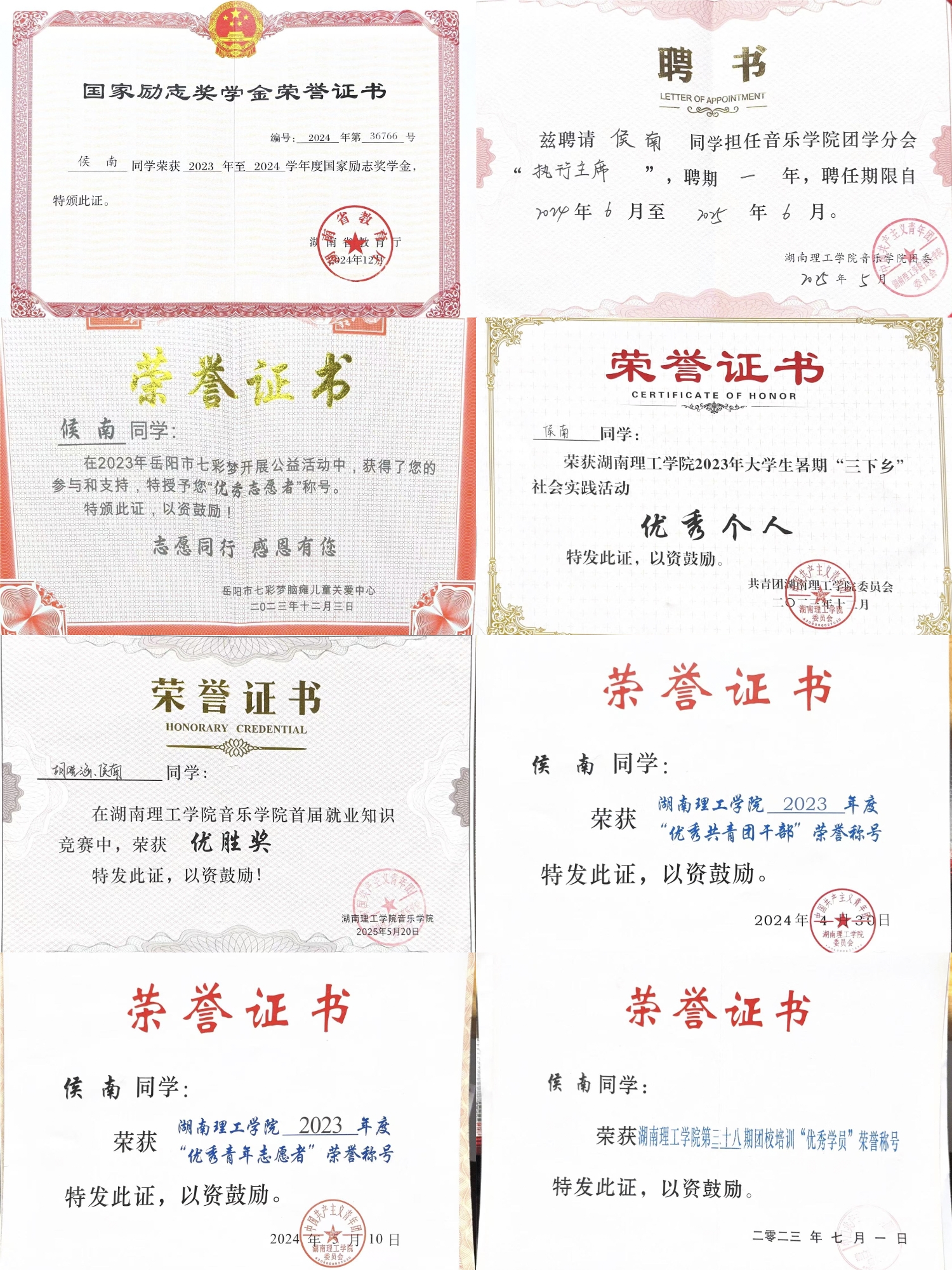 国家级、省级、校级的多项荣誉,既是侯南专业深耕、道德践行的见证,更是他持续奋进的底气。他用坚守与担当,为前行者书写出“付出皆有回响”的生动答卷,也向我们展现了新时代大学生“德才兼备、知行合一”的最美模样。