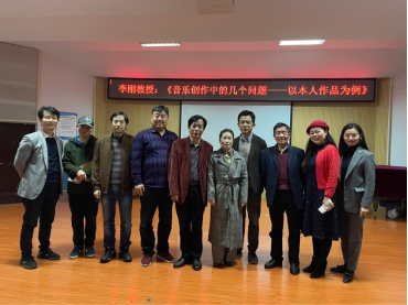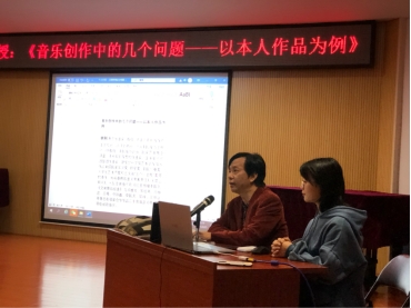 李刚教授结合上述问题,从自己的春晚歌曲《常来常往》,到军旅歌曲《边关情思》,到艺术歌曲《海那边》、《春之韵》,到改编合唱曲《在银色的月光下》,到流行歌曲《带着回忆来看你》、《梦中的爱》,到《红星照耀中国》中类似正歌剧的《饥民大合唱》,到舞剧音乐《花灯姑娘》等进行了阐释。这些作品展现了由作者自己娓娓道来,打动了在场的每一位听众,给人以强烈的听觉审美感受。李教授多次强调,作曲要考虑大众的口味,作品应该尽可能写得让老百姓听得懂;作曲要有好的理论支撑,作曲家是词作者的主人,不能为了技术而技术,纯粹炫技的音乐很难打动人心;音乐是十分细致的活,每一个音符都有其背后的意义,我们必须认真对待。李教授表示:音乐是最高级的艺术,它能表现哲理,我们应该为能够学音乐感到很幸福。作为现在和未来的音乐教育者,我们应该有对音乐怀有热情,虔诚地对待音乐和教学,学会聆听音乐,然后为全民音乐素质与能力的提高作出自己的努力。