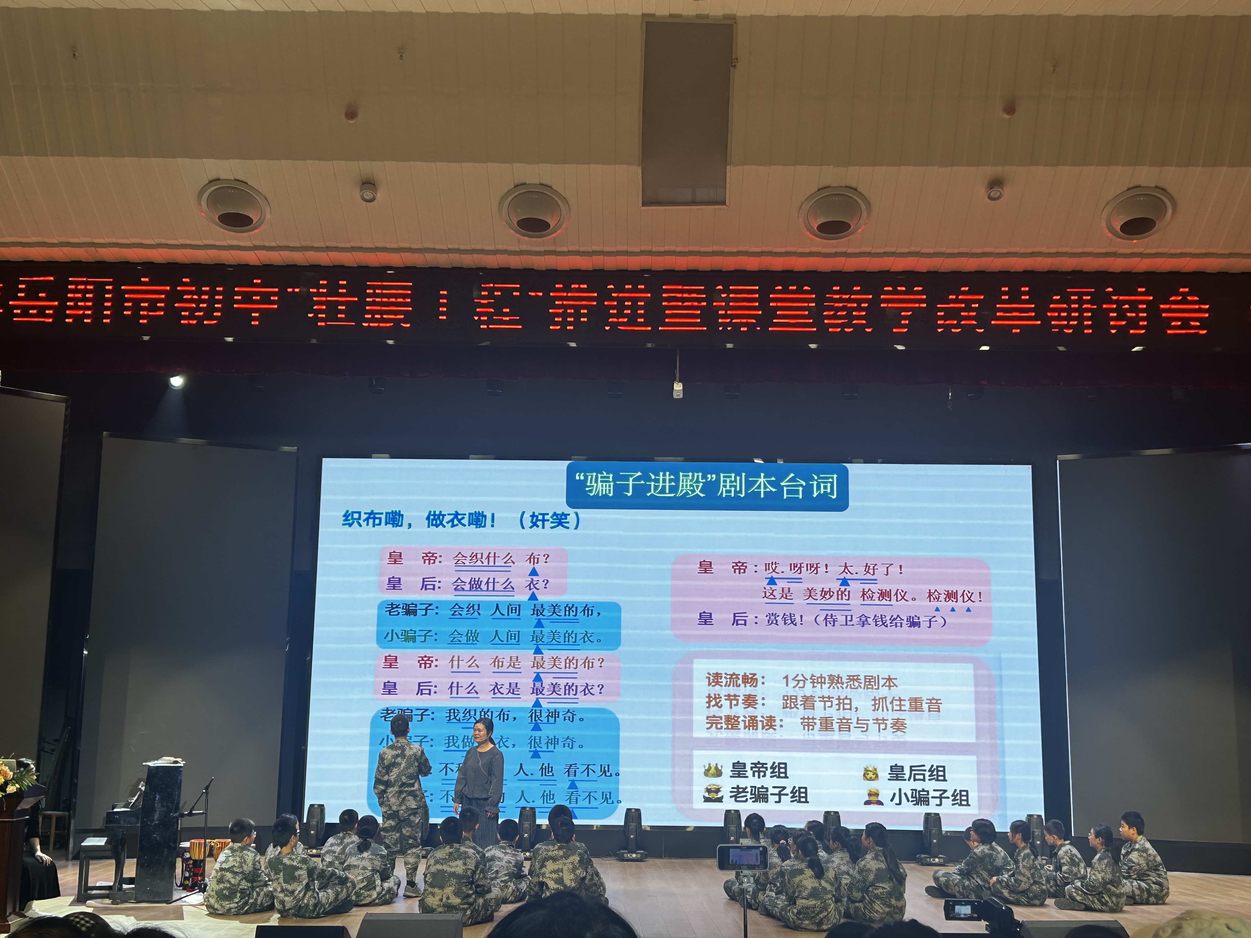八年级舞蹈课《舞动泼水节》 里,涂珊老师将民族舞蹈的韵律与学生的课堂互动巧妙结合,我们看到“新课标”中“艺术实践”的要求如何落地;七年级戏剧课《皇帝的新装之骗子进殿》 更是让我们眼前一亮,彭莹老师带着学生在戏剧表演中理解人物、品味文学,原来音乐与戏剧的融合可以如此生动。