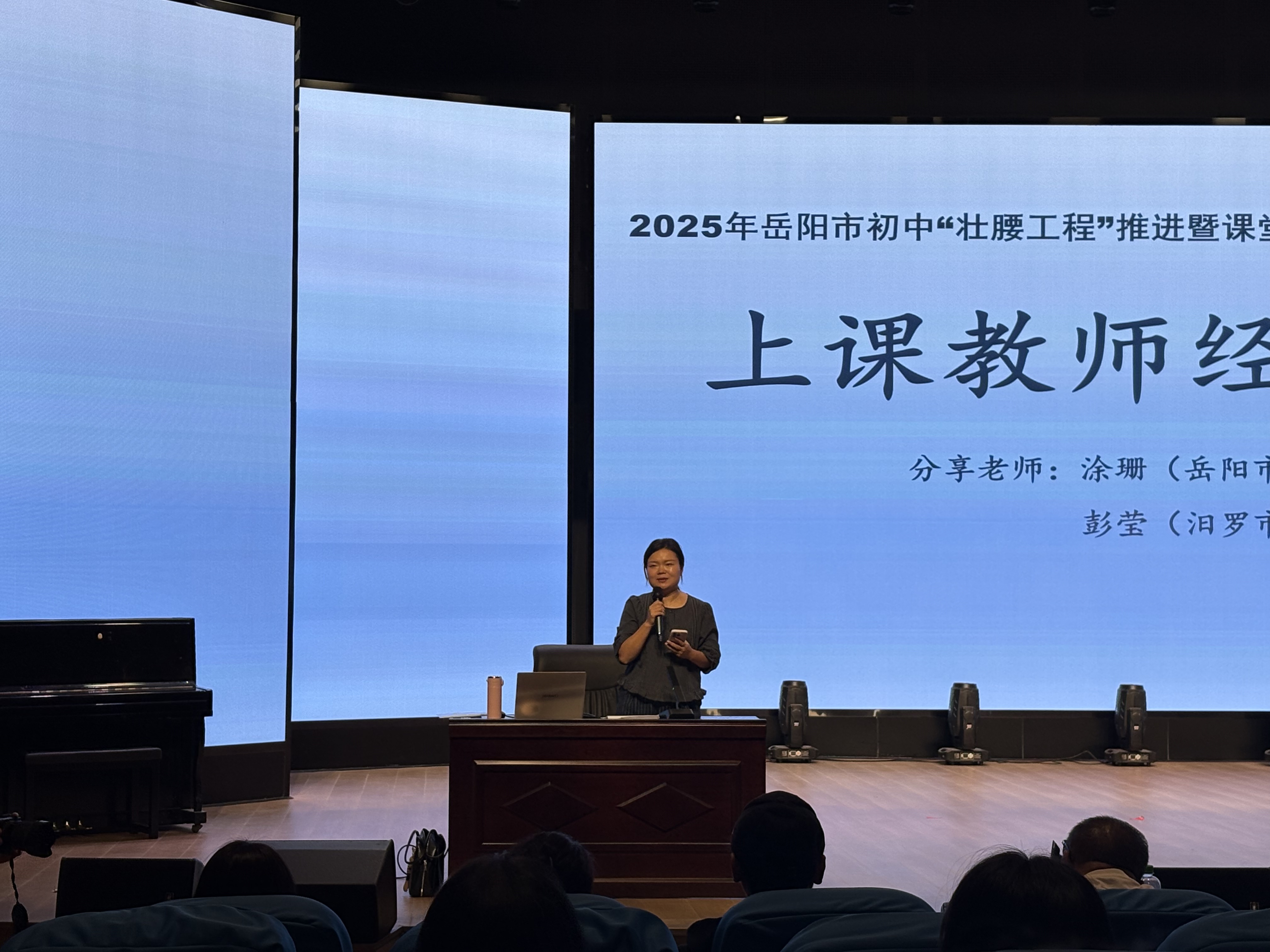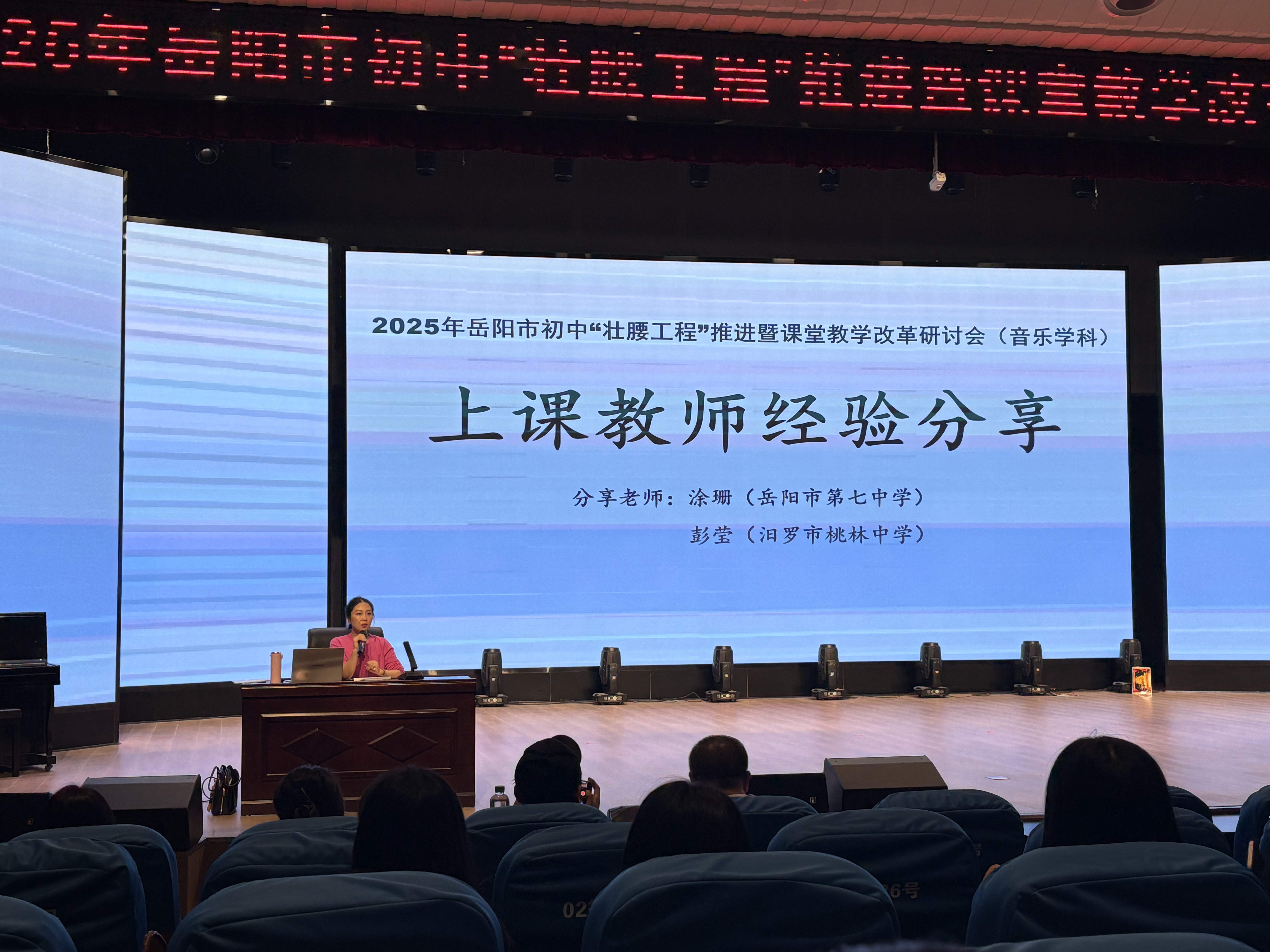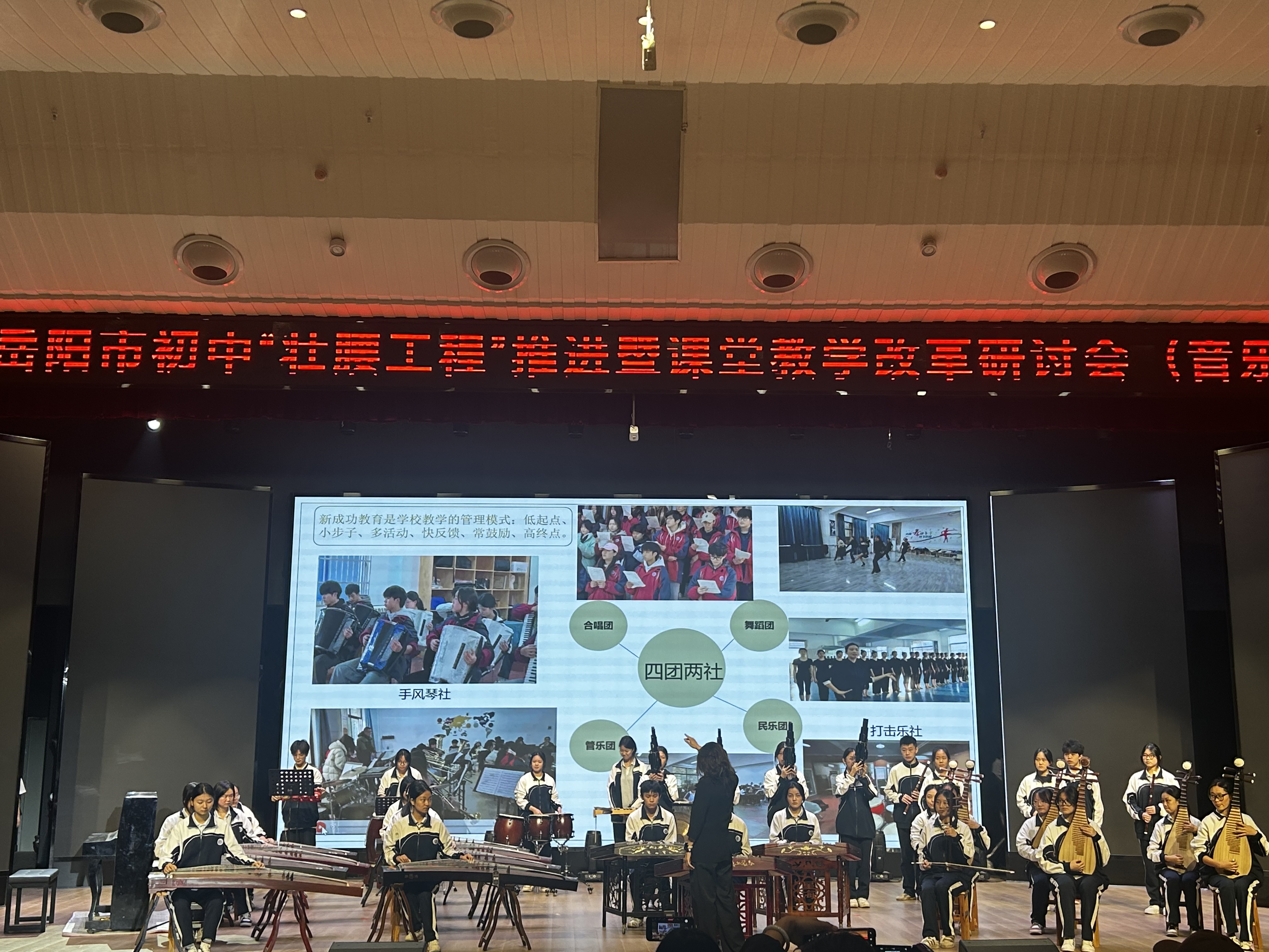 抵达后,在大雅楼综合演艺厅的签到环节,我们就感受到了这场教研活动的严谨与专业。而真正的惊喜,从岳阳市七中音乐教学教研经验分享开始——胡珊珊老师围绕七中师资情况、教学教研、社团建设、艺术实践成果等维度向我们进行介绍与展示,那些在书本里的“新课标理念”,瞬间在真实的教学场景中变得鲜活起来。
