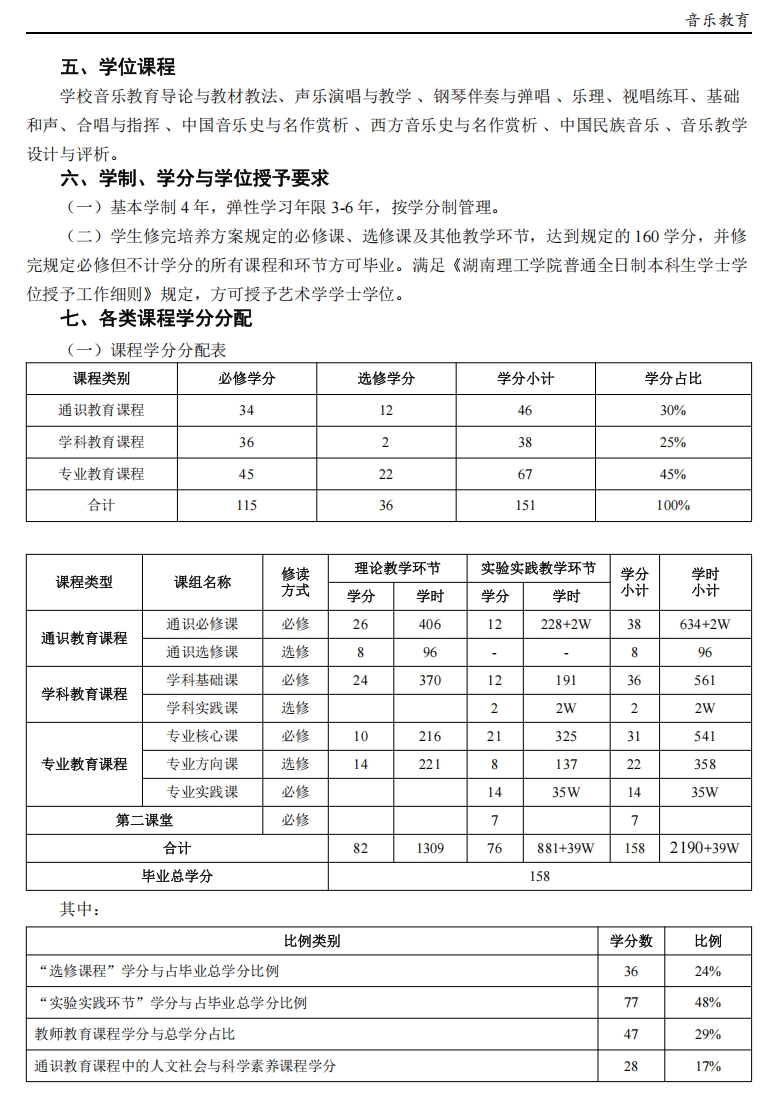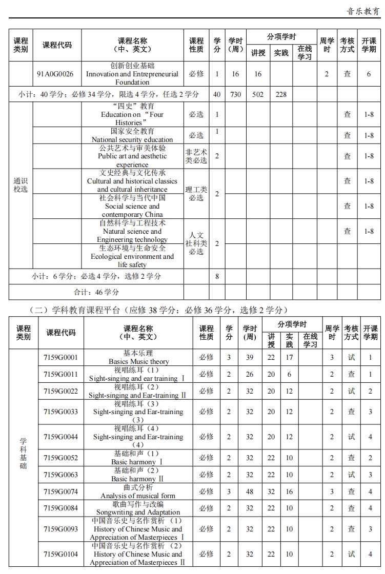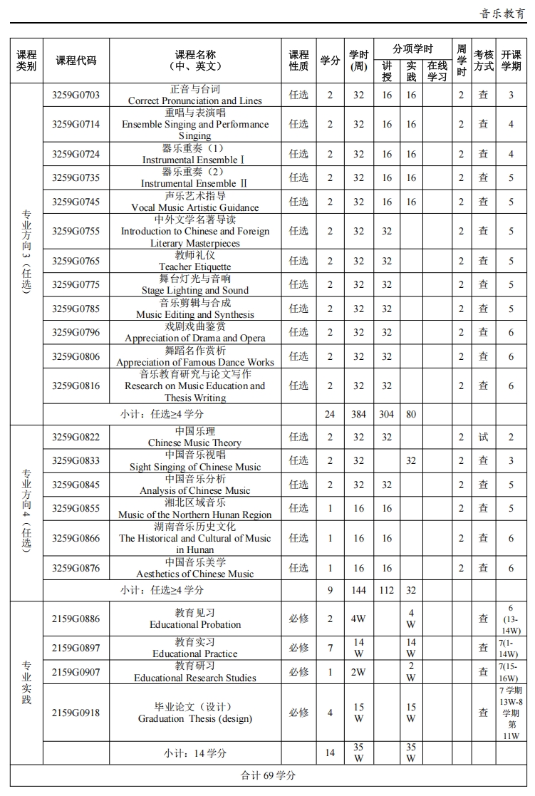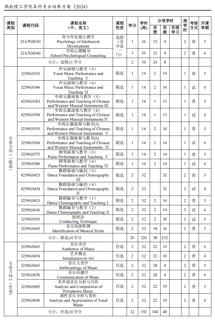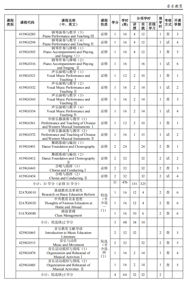 限选课程:音乐教育专业学生在修读声乐演唱与教学(1、2、3、4)、中西乐器演奏与教学(1、2、3、4)基础上,第五、六学期可以限选声乐演唱与教学(5、6)、中西乐器演奏与教学(5、6)、舞蹈编导与教学(1、2)具体人选由相应教研室推荐;限选类课程块修读≥4 学分。