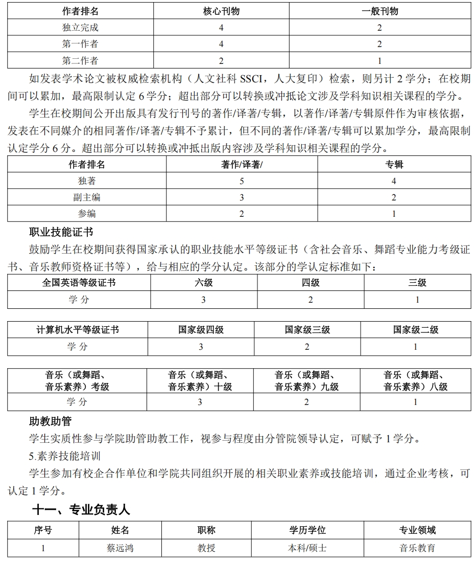 包括在校期间完成学科及专业竞赛、大学生创新实验类项目、音乐活动观摩等训练活动、公开发表学术论文或作品、职业技能证书以及助教助管,具体学分认定如下: