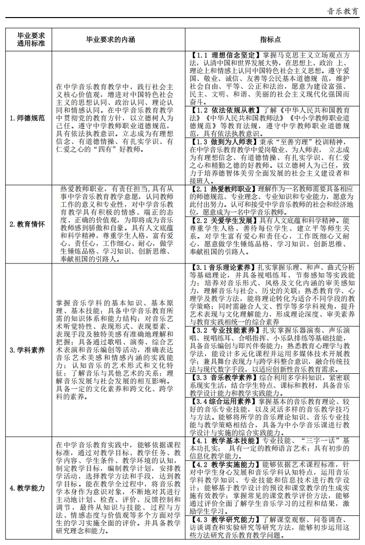 目标 3(教学能力):具有丰富的教育教学知识,能综合运用音乐学、教育学、心理学等有关知识进行中学音乐教学设计、课堂教学、教学评价、课程开发与课题研究。具有启迪学生理性思维、培养学生创新意识,提高学生发现问题、提出问题、分析问题和解决问题的能力。