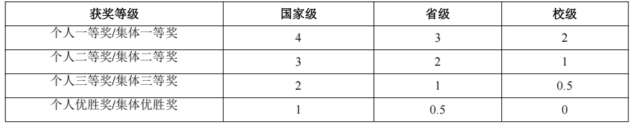 要求学生通过参加校内或校外与专业直接或间接相关的学科及专业竞赛,赋分须由学生个人申报,教辅人员审查证书原件,赋予相应学分。折算学分数分别为: