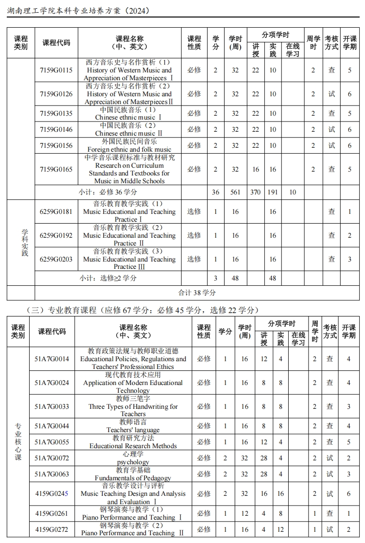 3.学科实践中的《音乐教育教学实践 1、2、3》课程指以组为单位在校内外导师指导下开展校内外教学观摩、音乐教育考察与调研、音乐教学方案设计、研讨与实施等。专业实践中的《音乐活动组织与排练 1、2》课程指在校内外导师指导下开展中小学班级合唱、小乐队排练、课外音乐活动组织与策划、学校艺术节策划、组织与排练等,并以音乐会或者中小学校活动与组织排练的节目单与录像进行考核。