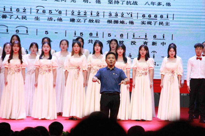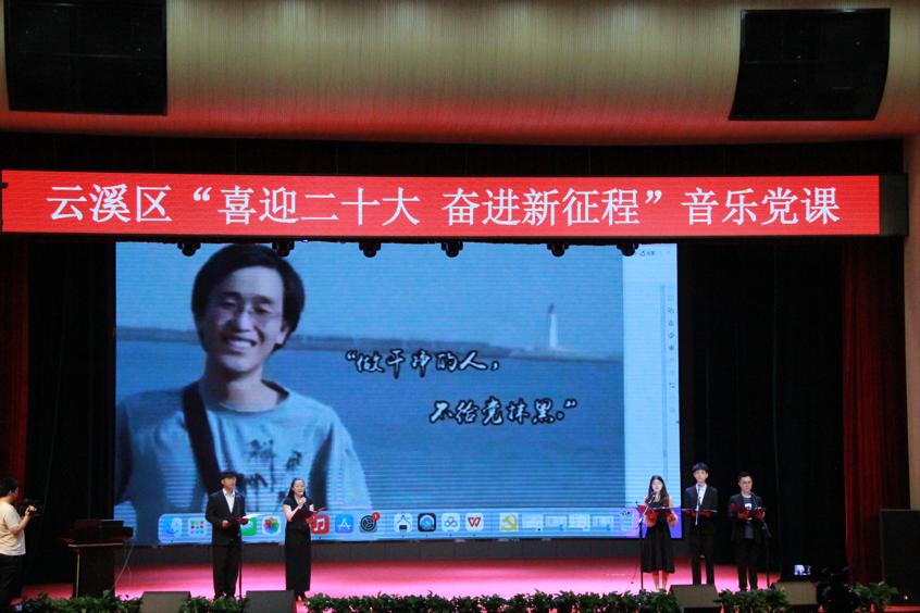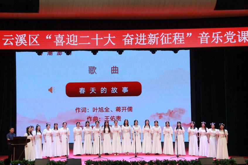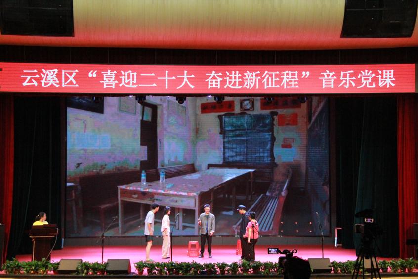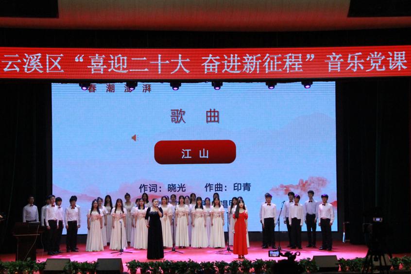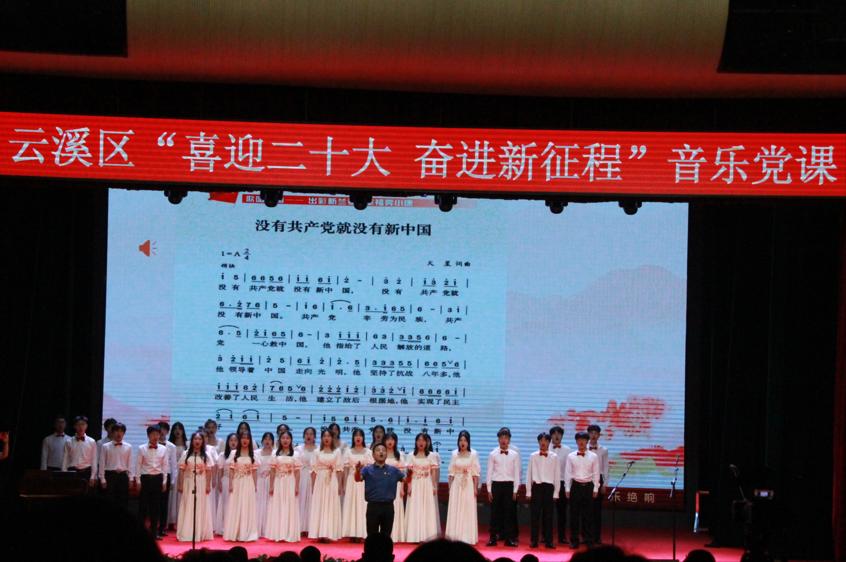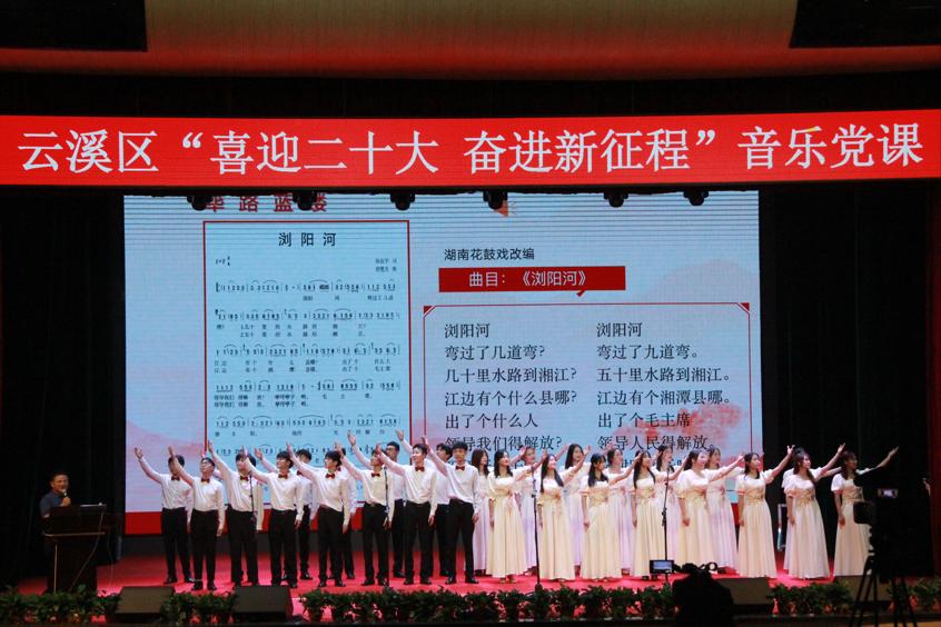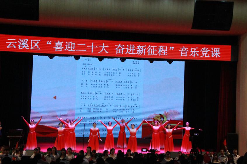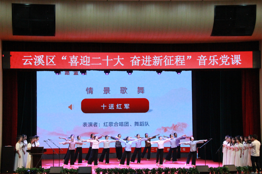 紧接着由我院党委书记黄皓华开始授课。本次音乐党课黄皓华书记将中国共产党党史与中国近代音乐史两条脉络交织融合为主线,讲述并充分展现中国共产党带领全国人民在中国革命、建设、改革以及伟大中国梦的历史进程中取得的重大成就。一首歌伴舞《我和我的祖国》拉开了云溪区“喜迎二十大 奋进新征程”音乐党课的序幕。
