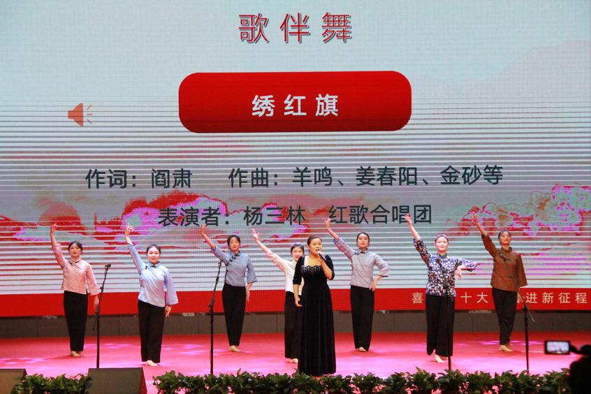 第一面中国共产党正式党旗在延安诞生,无数革命烈士以不同方式表达了对党旗的热爱。我院青年教师杨三林及舞蹈队带来的《绣红旗》,表达了中华儿女热爱党、热爱祖国的一片苦心,对新中国成立的渴望与向往。一盏党旗,书写了无数革命先辈的经历与寄托。
