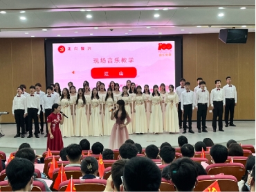 党课最后全体师生起立,共同合唱歌曲《走向复兴》,在场的全体同学铿锵有力的承诺“请党放心,强国有我!”中,本次音乐党课走向尾声。