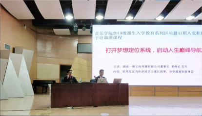 10月17日晚19:00,我院在音乐厅开展了2019级新生入学教育系列讲座暨41期入党积极分子培训班课程,党总支书记钟坚、学工办主任刘姣花、团总支书记方从戎、19级辅导员邹敏出席了本次活动,并且特别邀请我校2003届优秀毕业生——湖南省一帧文化传媒有限公司董事长曾稳定先生作为主讲嘉宾。下面,让我们跟随着曾先生的成长经历,去感受一个不平凡的人生故事。