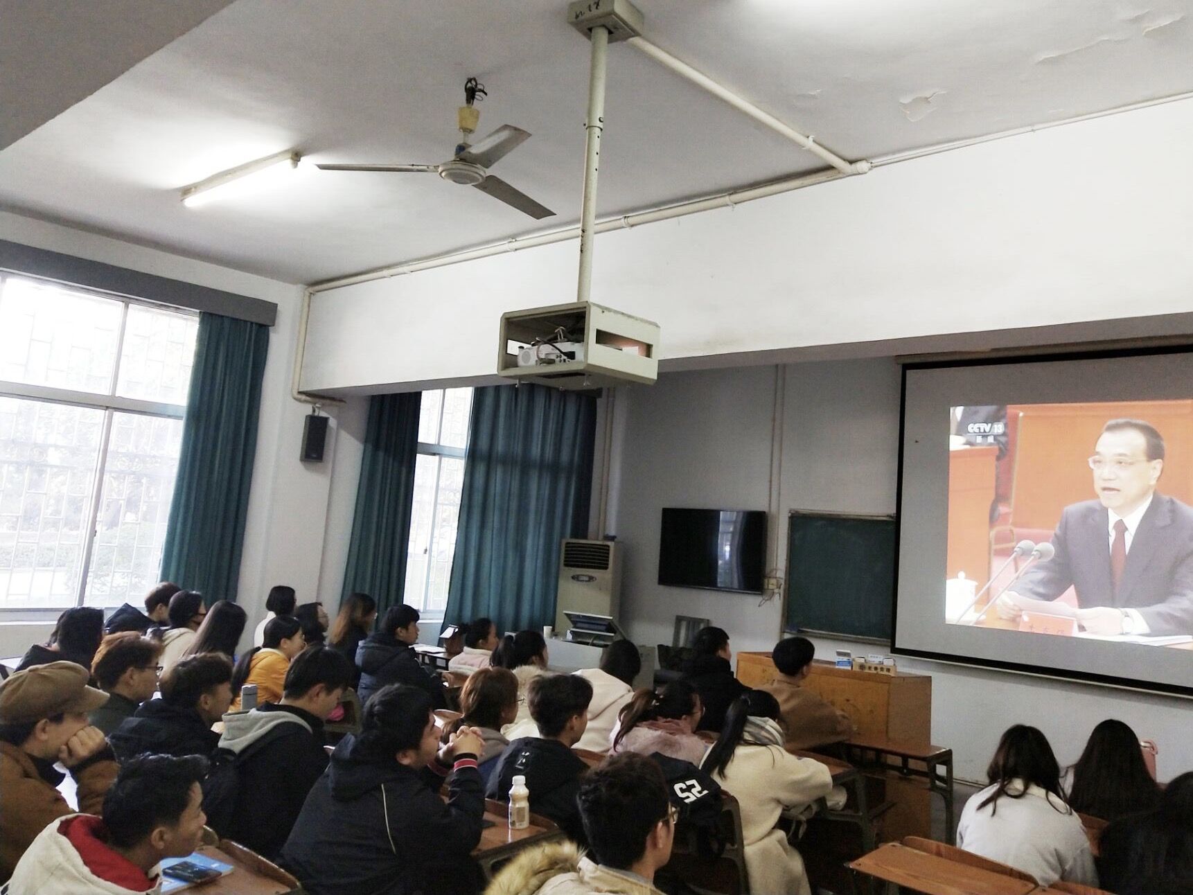 辅导员方从戎、朱葳带领17、18级没课的130多名同学在音乐楼4111教室观看,观看过程中同学们十分认真。