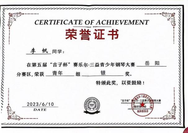 2023年第五届“言子杯”赛乐尔·三益青少年钢琴大赛岳阳分赛区青年组银奖 |