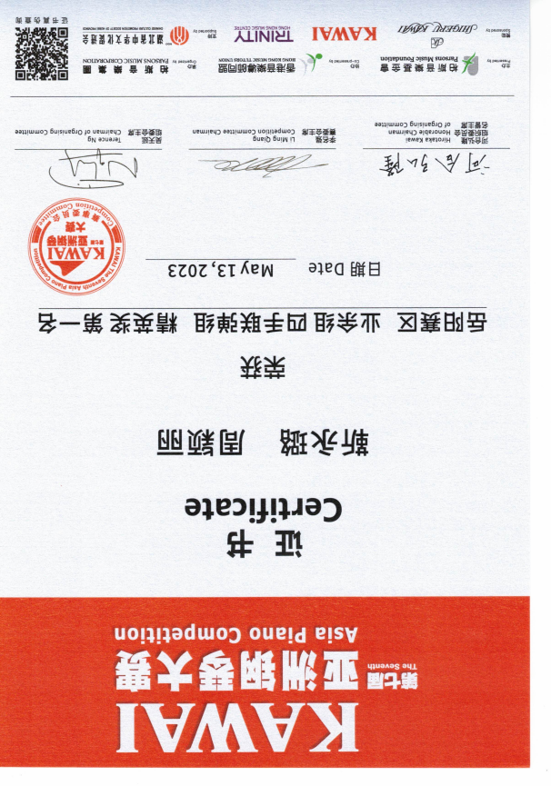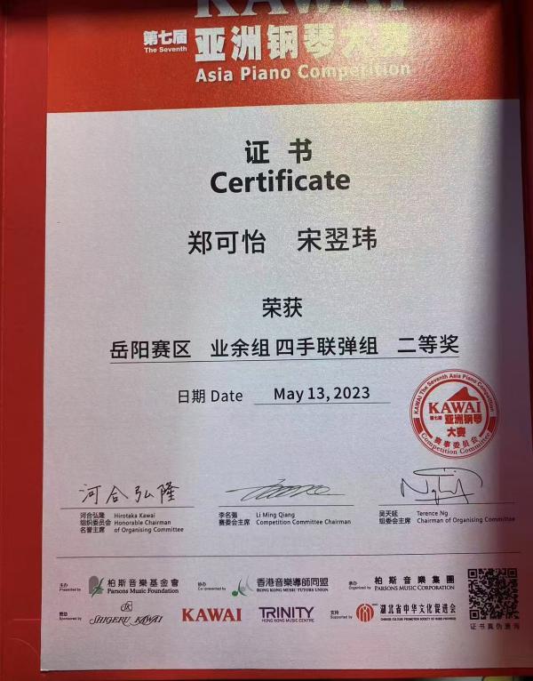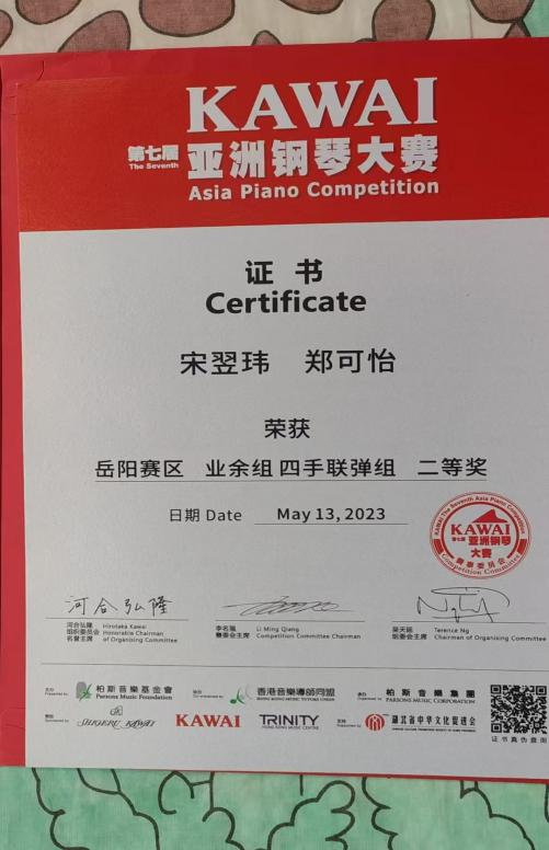 2023年第七届KAWAI亚洲钢琴大赛四手联弹组二等奖。 |