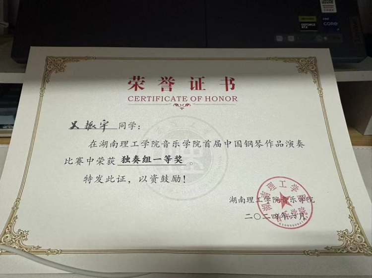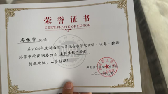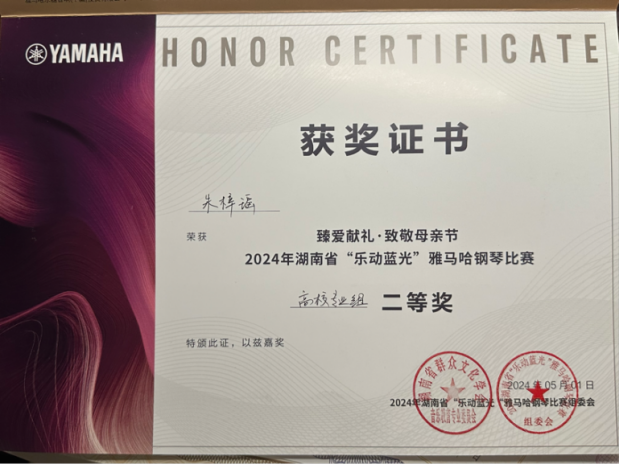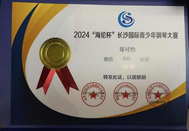 2024年“海伦杯”长沙国际青少年钢琴大赛高校组二等奖。 |