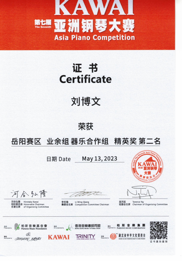 2023年第七届KAWAI亚洲钢琴大赛器乐合作组二等奖 |