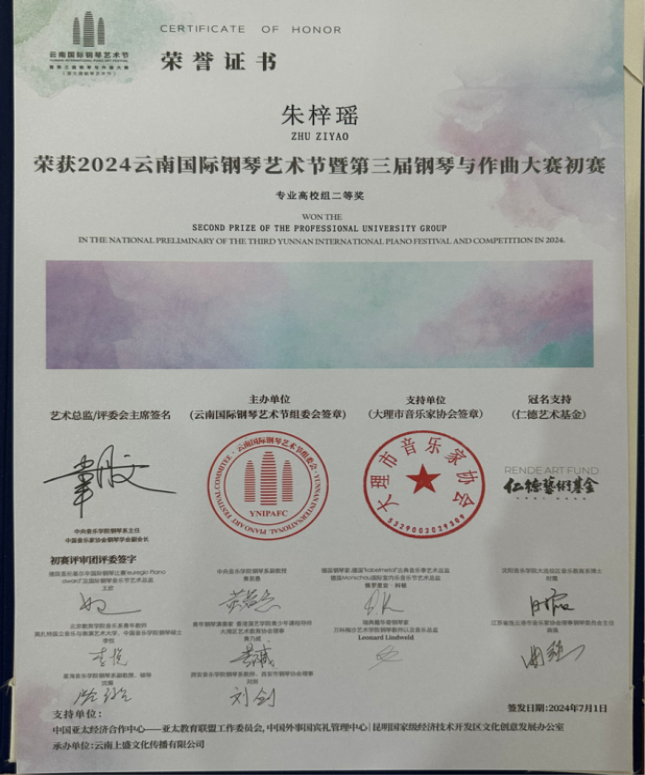 2024 云南国际钢琴艺术节暨第三届钢琴与作曲大赛荣获专业高校组二等奖 |