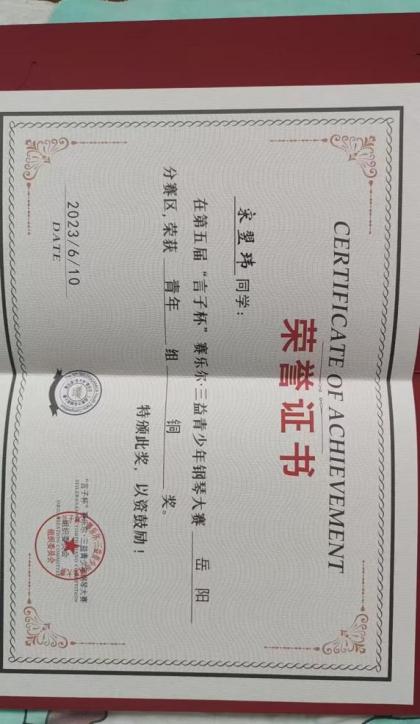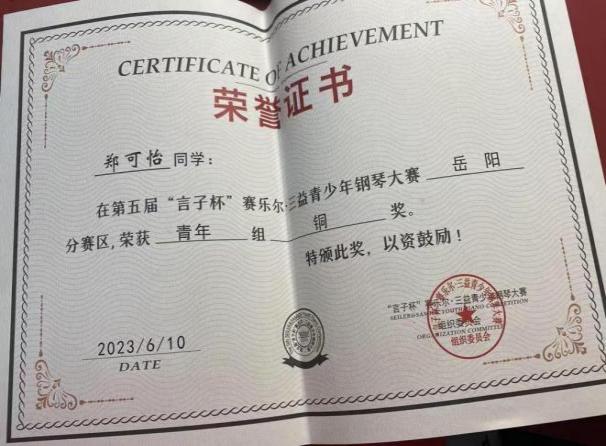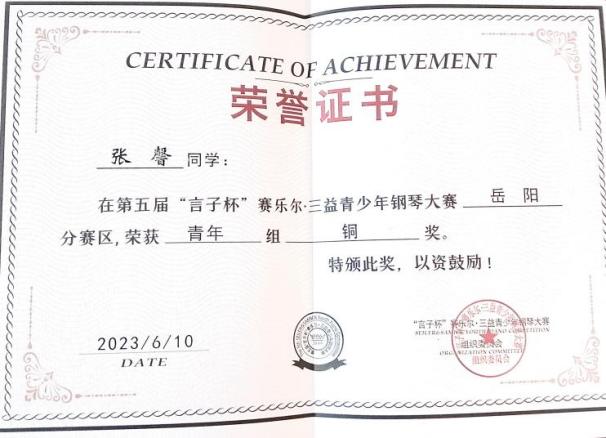 2023年第五届言子杯赛乐尔·三益青少年钢琴大赛岳阳分赛区青年组铜奖。 |