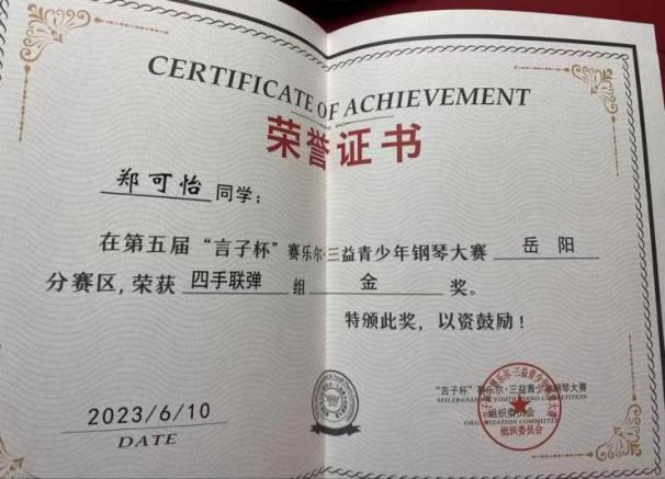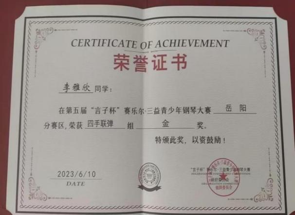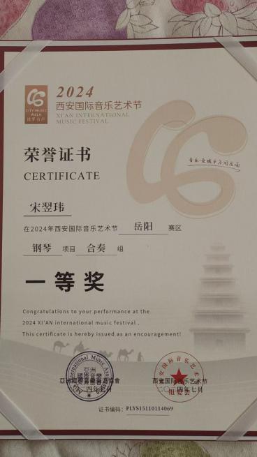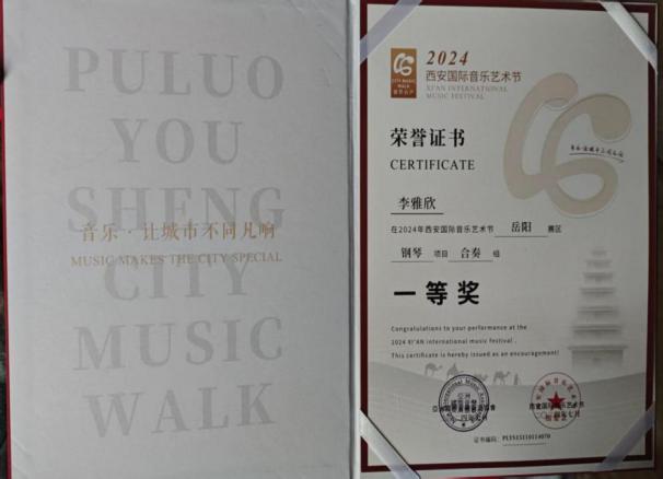 2024年西安国际音乐艺术节岳阳赛区钢琴合奏组一等奖。 |