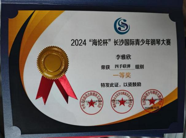 2024年长沙国际青少年大赛“海伦杯”四手联弹组一等奖。 |