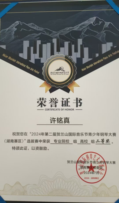 2024贺兰山国际钢琴艺术节青少年钢琴大赛荣获专业高校组二等奖 |
